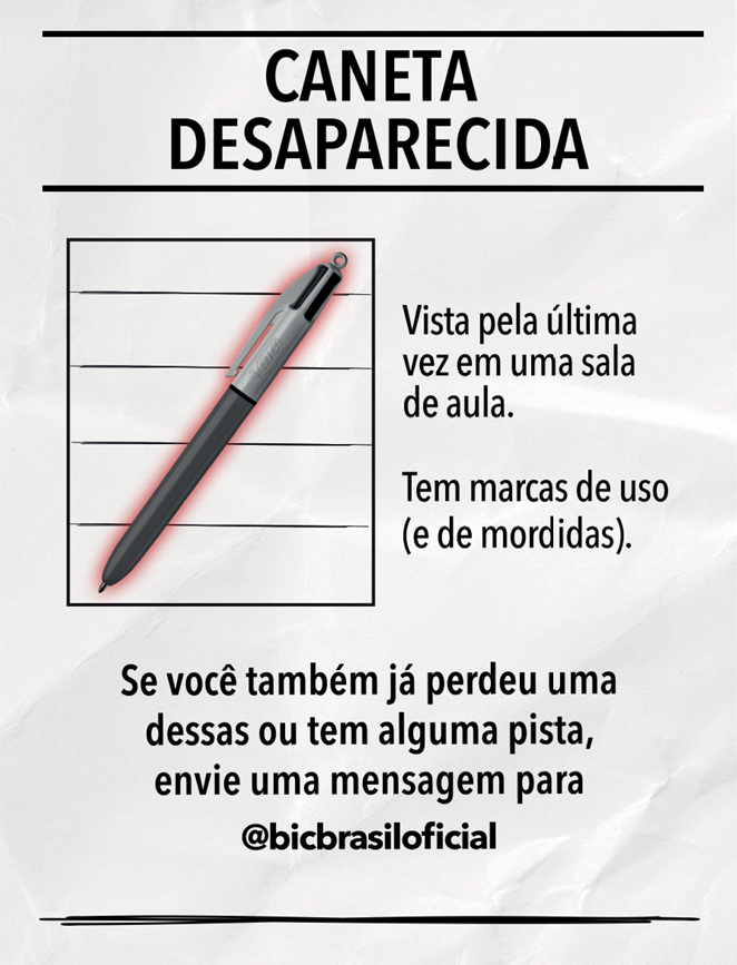 A BIC deu início a uma nova estratégia de comunicação nas redes sociais, lançando campanha digital em torno do “desaparecimento misterioso de canetas BIC 4 cores”. De acordo com o que vem sendo publicado no site da marca e em suas redes, alguns episódios sugerem um enigma e anunciam até mesmo uma investigação interna.