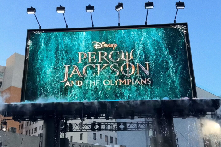Um dos cruzamentos mais movimentados de Los Angeles, o Holywood & Wine, foi transformado em uma cachoeira real pela Disney+ para o lançamento da segunda temporada de ‘Percy Jackson e os Olimpianos’, um outdoor real de onde jorra água em abundância.
