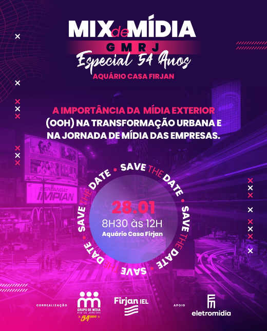 O Grupo de Mídia do Rio de Janeiro (GMRJ) completa 54 anos no próximo dia 29 de janeiro. Na véspera, dia 28, das 8:30 às 12:00 horas, em correalização com a Casa Firjan, a entidade promove um ‘Mix de Mídia’ especial, em comemoração à data, com o tema ‘O OOH e as Cidades’ – a importância da mídia exterior na transformação urbana e na jornada de mídia das empresas.