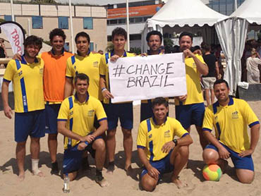 A seleção brasileira de beach soccer em Cannes entrou em campo com uma faixa dizendo #ChangeBrazil, em apoio às manifestações do país por melhores condições de saúde, educação, segurança e cidadania.