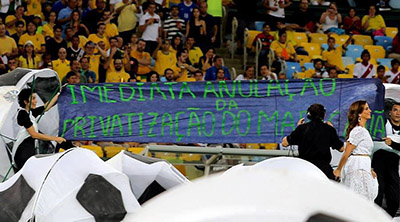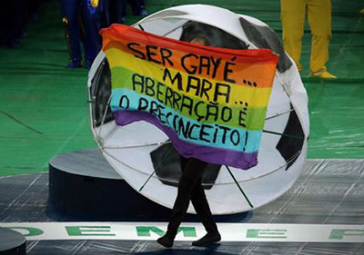 O barato sai caro. Em marketing, então, nem se fala. O resultado de a Fifa utilizar voluntários como bailarinos para as coreografias da festa de encerramento da Copa das Confederações deu no que todo mundo já sabe. Os atores Alex Tietre, Claudia Wer e Elton Carvalho aproveitaram estar no gramado e abriram faixas que diziam "Imediata anulação da privatização do Maracanã" e "Ser gay é...mara...aberração é o preconceito!".