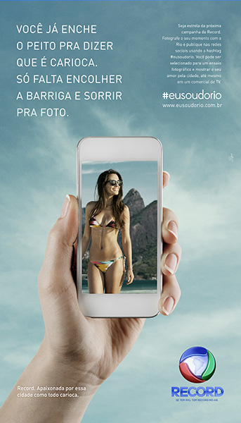 A Record Rio, que em 2010 e 2011 chegou a promover o Prêmio Atitude Carioca, para destacar quem mais fizesse pela cidade, vem agora com uma campanha que quer escolher pessoas que tenham a cara do Rio. Com peças criadas pela agência Loja, a emissora lança esta quinta-feira, 29/01, uma ação propondo que os cariocas fotografem o seu momento com o Rio e publiquem nas redes sociais com a hashtag #eusoudorio.