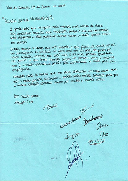 Quem disse que não se escrevem mais cartinhas de amor? A agência C+A -- sigla de Caraciolo + Associados -- resolveu resgatar a tradição e nos mandou uma cartinha de amor pelo dia dos namorados, escrita à mão, e garantindo que não quer deixar "nossa relação passar assim em branco".