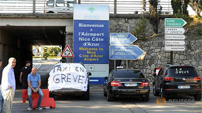 Ou é dos aviadores, dos motoristas de busão, maquinistas de trem. Hoje começou a greve dos taxistas. A turma não se contentou em só parar de circular mas também fecharam a entrada e saída do aeroporto de Nice.